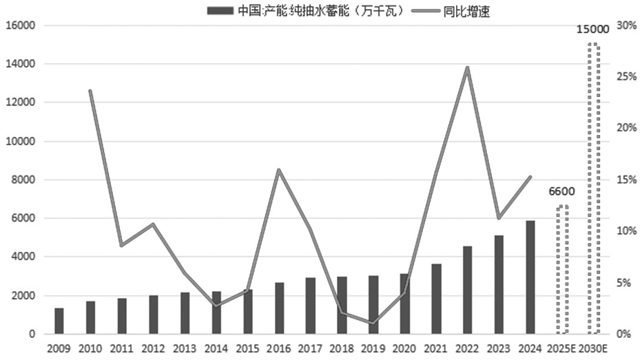 按照国家能源局发布的《抽水蓄能中长期发展规划(2021—2035年)》,2025年抽水蓄能投产总规模较“十三五”翻一番,达到6200万千瓦以上;到2030年,抽水蓄能投产总规模较“十四五”再翻一番,达到1.2亿千瓦左右。