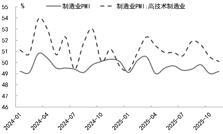 11月制造业PMI为49.2%,较上月回升0.2个百分点,制造业景气度边际改善。产需两端同步好转,生产指数和新订单指数分别为50 %和49.2%,较上月回升0.3个和0.4个百分点,尤其是生产指数已经回升至临界点。此外,新出口订单指数回升1.7个百分点,至47.6%,外需压力逐步缓解。不同规模企业分化格局延续,小型企业PMI为49.1%,回升至近6个月高点,景气度实现快速反弹,大型企业景气度有所回落,中型企业景气度略有回升。价格方面,主要原材料购进价格指数和出厂价格指数分别为53.6%和48.2%,较上月提高1.1个和0.7个百分点。今年下半年以来,“反内卷”推升原材料价格中枢上行。新动能保持引领作用,高技术制造业PMI为50.1%,已经连续10个月位于临界点以上,凸显产业升级韧性。高耗能行业PMI为48.4%,比上月上升1.1个百分点,但仍处于收缩区间,新旧动能转化稳步推进。企业经营信心进一步增强,生产经营活动预期指数为53.1%,较上月提高0.3个百分点。