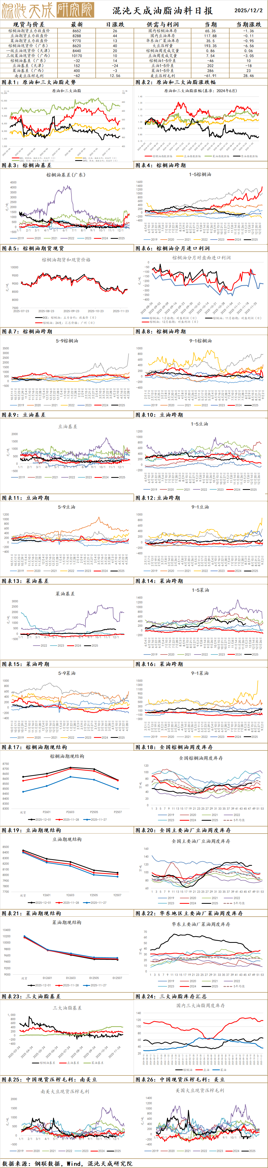 昨日棕榈油主力收盘8652元/吨,上涨64元/吨,涨幅0.75%;基差:天津108(24),山东78(-46),江苏48(14),广东-32(14)。
