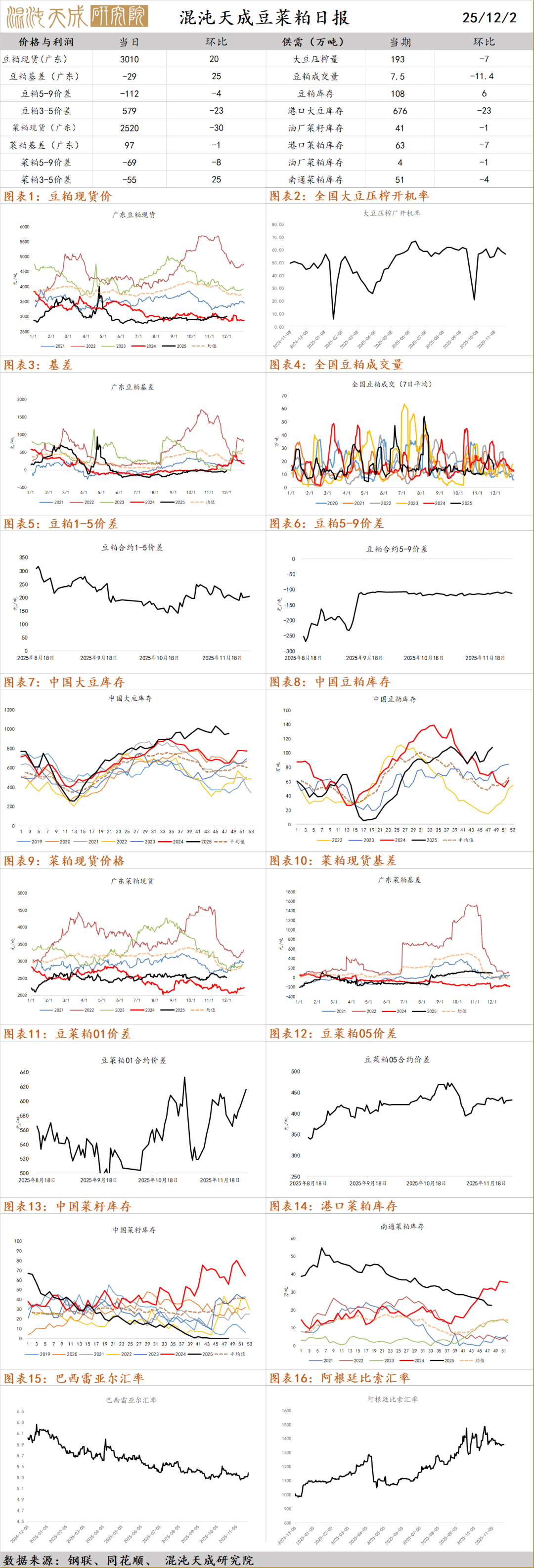 观点汇总:近期粕市震荡运行下重回弱势,主要原因是近月大豆到港仍然充裕,供需缺口较小,油厂开机稳定增加国内豆粕库存,使得粕价格偏弱运行。中远期角度看,目前美豆仍然存在出口中国的预期,而南美和巴豆供应充裕,豆粕远月紧缺预期较弱,策略上建议观望等待政策进一步指引为主。