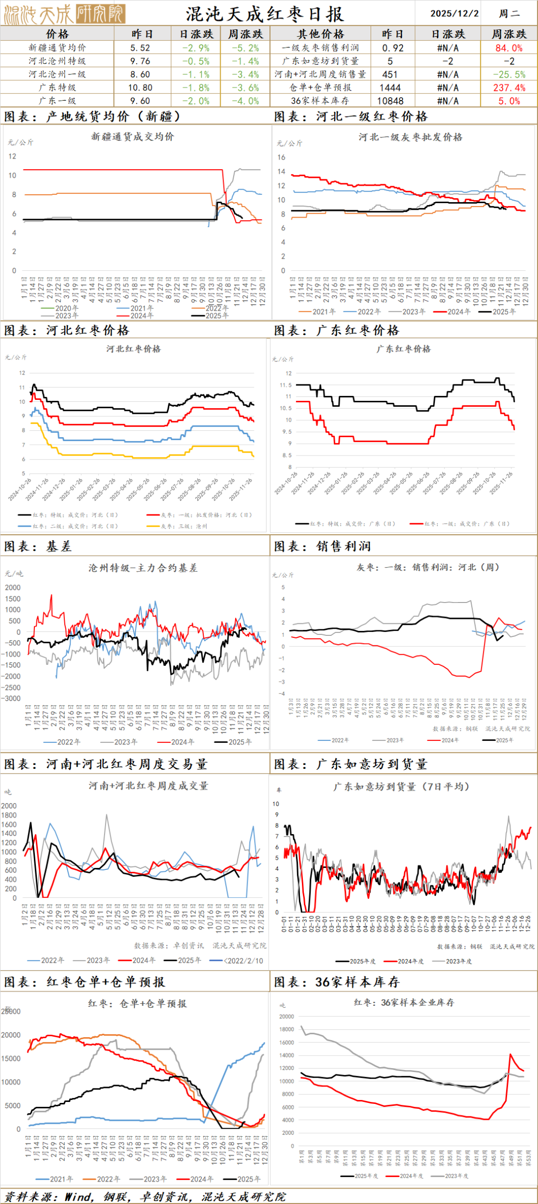 目前新疆产区灰枣收购进度在8成左右,周末期间三师及麦盖提地区收购增速,目前各产区仅剩部分质量一般及部分挺价卖方。阿克苏地区通货主流价格参考4.80-5.20元/公斤,阿拉尔地区通货主流价格参考5.00-5.80元/公斤,喀什团场成交价格参考6.00-6.50元/公斤,麦盖提地区价格参考5.80-6.30元/公斤,若羌、和田及且末地区收购结束,产区原料收购以质论价,维持优质优价原则,企业收购积极性一般;河北崔尔庄市场交易以新货为主,成交价格趋弱运行;广东如意坊市场到货5车,早市成交2车左右;陈枣现货抛售压力增大,收购价格预计偏弱,今年产量维持55万吨±5万吨的观点,整体供需过剩比较明确,目前盘面已经大幅下跌,维持反弹逢高空的策略。