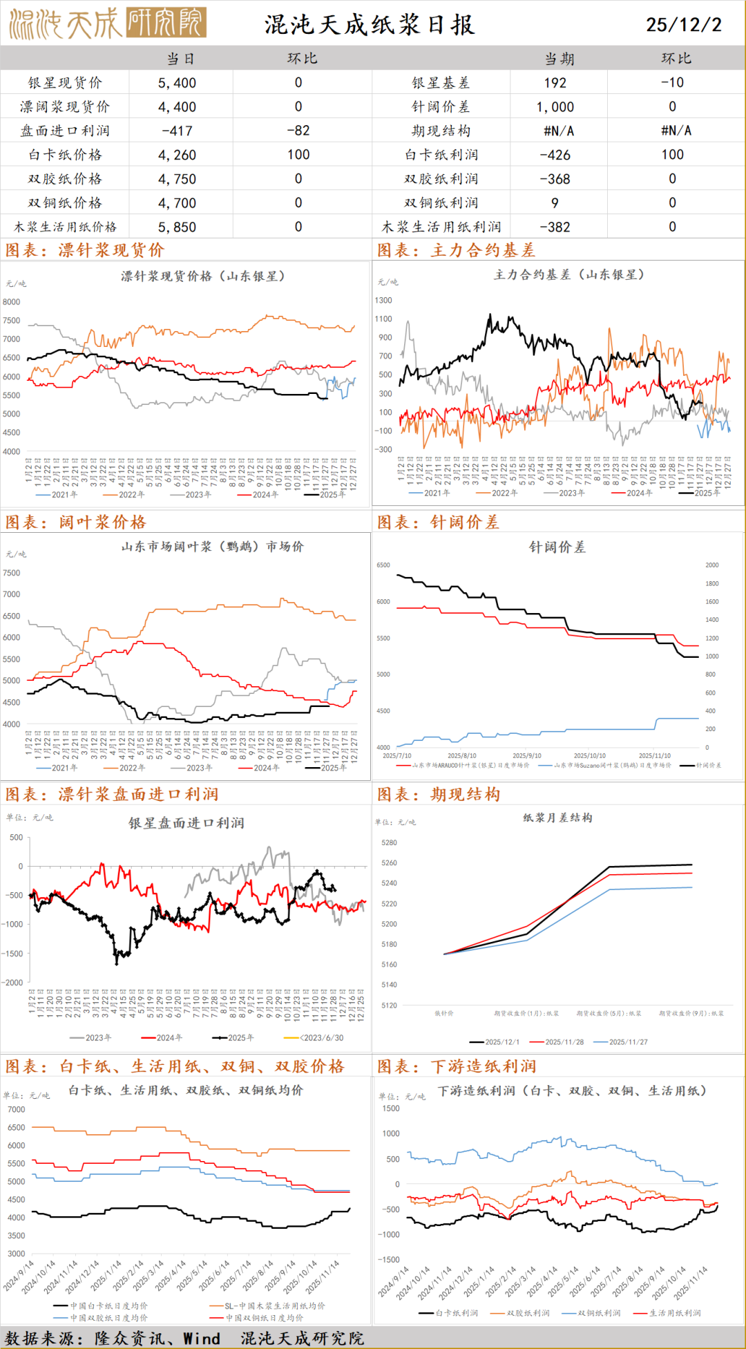 纸浆:昨日国内针叶浆现货稳定,银星5400元/吨(0),俄针5170元/吨(0);阔叶浆现货稳定,金鱼4400元/吨(0);针阔叶浆价差1000元/吨(0),纸浆市场整体呈现交投清淡、价格持稳;白卡纸市场业者观望为主,部分贸易商跟进纸厂价格上调,部分保持观望态度,部分品牌间价差加大;生活用纸市场价格区间盘整,场内整体交投氛围略显平静,市场观望情绪较浓;行业盈利及产销压力下,部分工厂转产及降负荷情况存在,同时年内新增产能较多,行业货源供应充裕;供应端压力持续存在,港口库存呈现累库走势,需求端仍显疲软,下游纸厂维持刚需采购策略,成品纸订单释放有限,成品纸继续累库,基本面改善不明显,短期情绪有所下降,仓单逻辑弱化,维持偏弱震荡,关注纸厂补库和宏观影响。