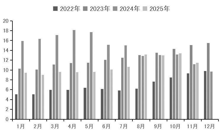 三季度以来,行业多次召开高层研讨会,聚焦非理性竞争、低价中标及知识产权纠纷等问题,倡导形成“质量优先、技术驱动”的共识,推动招投标机制、摒弃“唯最低价中标”,强化安全生产与生态导向,通过标准升级实现优质优价。1—10月国内光伏新增装机252.87GW,同比增长39.48%,其中10月新增装机12.6GW,同比下降38.3%,环比增长30.4%,延续9月以来的回暖态势,行业正从8月的近3年的低点逐步复苏。受政策调整下需求前置的影响,今年第四季度传统施工旺季的规律被打破,目前行业正逐步恢复常态。在新政与行业自律共同推动下,预计2025年国内光伏新增装机将逐步回落至理性区间。