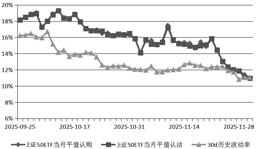 期权隐含波动率日内窄幅徘徊,截至收盘,与前一交易日持平。上证50ETF当月合约平值期权隐含波动率为10.98%。历史波动率持续下行,上证50ETF的30日历史波动率为11.04%,沪深300指数的30日历史波动率为14.34%。隐含波动率与历史波动率差值持续收缩。