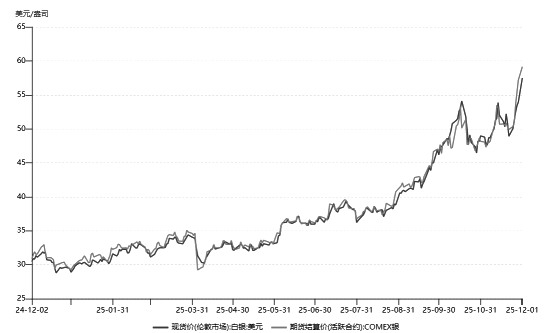 图为2024—2025年伦敦白银现货和纽约白银期货价格走势