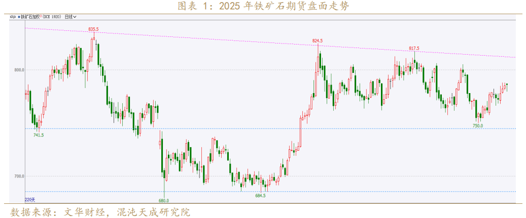 2025年铁矿石市场整体呈现的是一个宽幅震荡的走势,虽然年内680左右的底部支撑相对偏强,但全年价格顶部是在逐渐下移的。年初,在“抢出口”带来的需求支撑及国内政策向好预期的助推下矿价表现偏强并创出年内高点,之后受国内经济尤其是地产、基建等需求持续下滑及特朗普上任后带来的关税政策波动等影响,铁矿价格持续震荡走弱,直到中美日内瓦会议后关税影响有所缓和,铁矿才逐步震荡筑底。下半年,受益于国内“反内卷”政策带来的宏观向好预期,叠加国内出口保持强劲带来的需求支撑,钢厂在淡季仍维持了高产量运行,矿价也因此大幅走强,但未突破上半年高点。此后,由于国内需求弱现实仍未有明显改善,而钢厂在淡季高产后导致库存压力上升,对铁矿的采购也开始偏谨慎,市场陷入宏观强预期与产业弱现实的博弈格局。