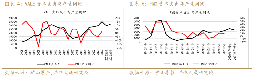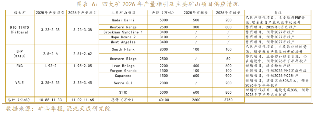 从近年来主流矿山的资本开支来看,除了RIO TINTO和VALE资本支出有小幅增长,BHP和FMG的资本支出基本保持平稳,说明主流矿山近年来没有显著的产能扩张计划。从四大矿的产量指引来看,2026年RIO TINTO的产量指引较2025年基本变动不大,BHP产量指引也仅有少量提质增效带来的增量,FMG产量指引随着Iron Bridge项目的投产有小幅增长空间。不过,VALE因为部分在建的新增项目有望在2026年下半年实现投产,其产量指引增幅相对较大。