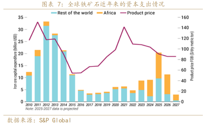 根据S&P Global的统计,2020年以来全球铁矿整体资本支出并不多,近几年的资本支出高峰是在2025年,从2026年开始将逐年下降,其中主要的资本支出大多都集中在非洲地区,全球其他地区的资本支出相对较少。