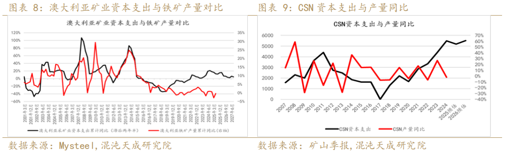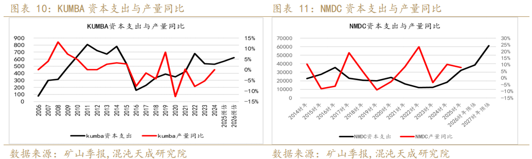 从澳大利亚矿业资本支出来看,近年已经开始呈现小幅下滑态势。不过,从巴西、南非、印度主要上市矿企的资本支出来看,巴西CSN的资本支出自2018年开始持续增长后到2025年已有所放缓,南非KUMBA的资本支出近两年仍在小幅上升,印度NMDC资本支出则从2024财年开始持续快速上升,这也在一定程度上反映了这些地区非主流矿的增长潜力。