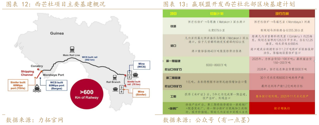目前,由赢联盟负责的北部矿区已实现每小时4000吨的产能,未来计划提升至每小时9000吨,最终年产量目标为6000万吨。由Simfer负责的南部矿区2025年10月已实现首批铁矿出运,待3个月系统调试后,计划在30个月内进行产能爬坡直至实现6000万吨的产量目标。结合两大矿区的建设进度和规划以及外资投行的预判,预计西芒杜铁矿在2026年产量可达3000-4000万吨,2027年有望实现6000万吨以上的产量,2028年或将达到9000万吨左右。