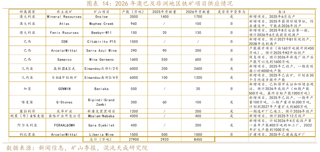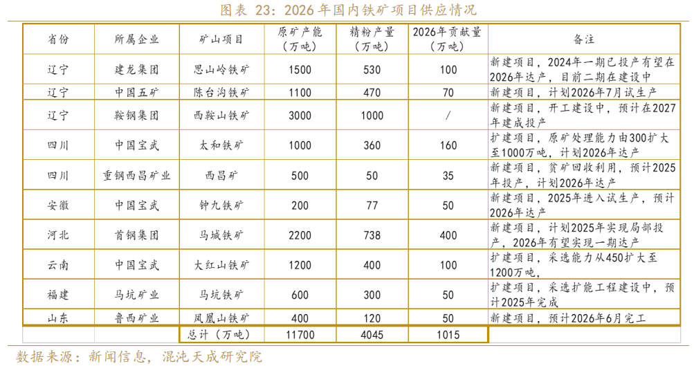 不过,受益于“基石计划”,近年来国内是有不少新老矿山的建设和改造项目在进行中,2025年公布的《钢铁行业稳增长工作方案(2025-2026年)》中明确提出,要强化产业科技创新,增强高端产品供给能力,稳定原燃料供给,加快国内重点铁矿项目开工建设、扩能扩产。支持合规矿企正常生产,避免行业整顿“一刀切”。实际上,这些新建、扩建的铁矿有不少是国家“两重”建设项目,随着2025年这些矿山工程建设的加速,预计2026年有不少可能实现投产或达产。根据国内主要铁矿项目统计,2026年国内矿供应增量预期可能在1000万吨左右。
