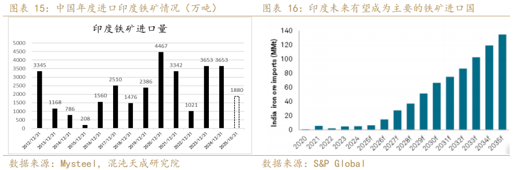 此外,印度未来仍可能是全球铁矿市场供应变数最大的地区,一方面因印度自身钢铁行业发展导致对铁矿的需求增大,近年来印度政府一直有计划提升对铁矿的出口征税;另一方面传统印度铁矿出口品种是以含铁量低于58%的低品矿为主,但随着中国对钢铁行业环保要求的提升,对这类低品资源需求下降,2025年中国从印度的铁矿进口量已有明显减少,截止到2025年10月末的数据显示对印度铁矿的累计进口量同比降幅超过40%。另根据S&P Global的预测2026年开始印度有可能从传统的铁矿出口国逐渐转变为主要的铁矿进口国。