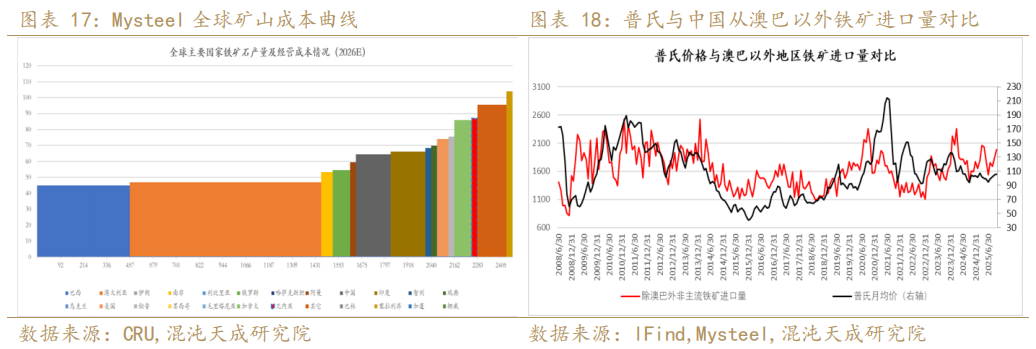 最后,考虑到非主流矿的供应与矿价的相关性较高,而2026年全球最主要的非主流矿增量将来自西芒杜铁矿,根据CRU测算的全球主要国家铁矿石经营成本情况,几内亚西芒杜铁矿在2026年的平均成本预期接近90美金的偏高水平,也就意味着若要保证西芒杜铁矿的顺利出货,早期矿价长期低于90美金的概率可能不大。不过,随着西芒杜铁矿产量的释放,其后期成本也将不断下移。另外,考虑到澳大利亚、巴西及非洲其它矿区新建产能的投放,中长期非主流铁矿市场或将迎来低成本高品铁矿不断取代高成本低品铁矿的过程,全球铁矿的内卷时代或将到来。