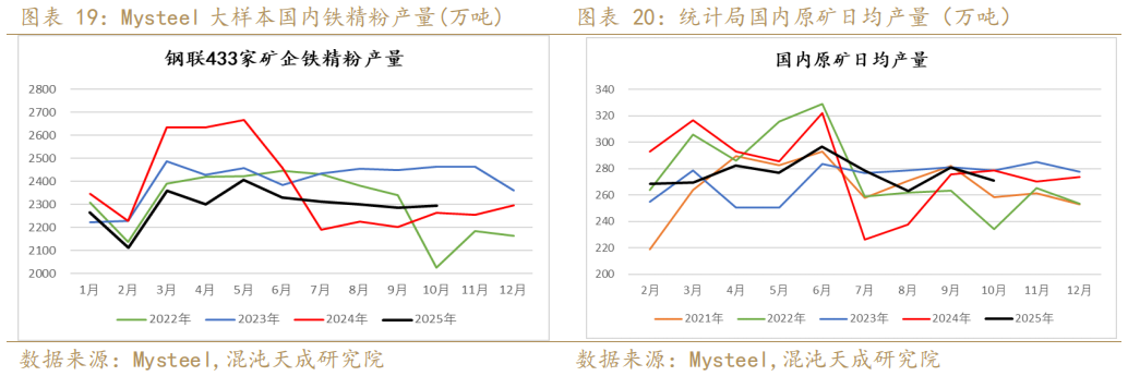根据钢联的大样本统计,2025年1-10月国内铁精粉产量累计达22966万吨,同比下滑3.7%。2024年国内铁精粉产量28401.6万吨,同比降1.5%。这意味着连续两年,国内铁精粉产量都未有增长。从统计局原矿产量来看,2025年1-10月国内原矿产量累计85173.6万吨,同比也下降2.3%。