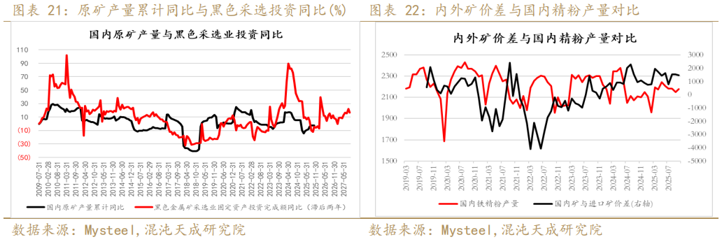 然而,从原矿产量与黑色采选业投资的对比来看,近几年国内黑色采选业投资同比处于高位,理论上国内矿产量也应当进入较高增长,那为什么国内矿供应反而是有减量呢?我们从内外矿价差与国内精粉产量对比来看,二者通常有一定的负相关关系:当内外矿价差处于低位,说明国内矿性价比更好,这时铁精粉产量往往处于高位;反之,当内外矿价差处于高位,说明进口矿性价比更好,这时铁精粉产量往往处于偏低水平。从近两年内外矿价差表现来看,一直是进口矿性价比较高,这也就导致铁精粉的需求相对偏弱,国内矿企业的生产积极性也不强。此外,近年来国家对安全生产、环保要求趋严,也在一定程度上影响了部分内矿企业的供应。