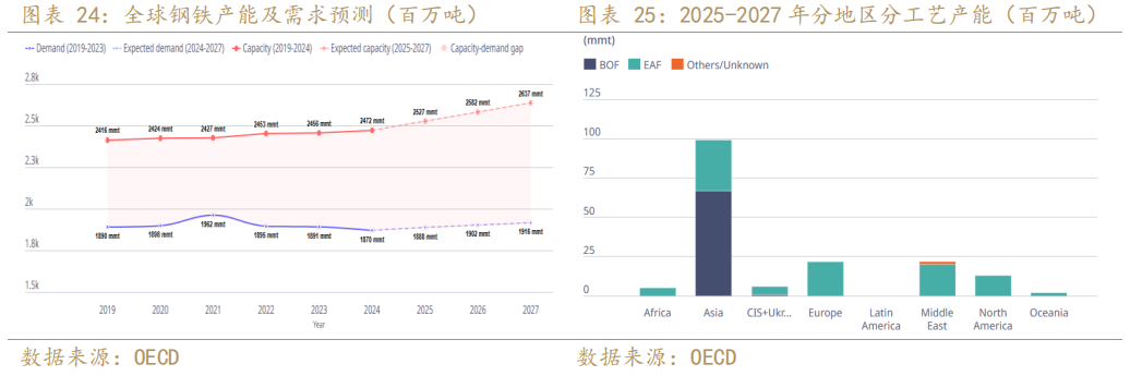 根据0ECD的统计,2025-2027年全球钢铁产能预计将增加1.65亿吨, 其中有超过40%的新增产能是采用高炉/转炉炼钢工艺,而这些产能基本都集中在亚洲地区,预计这些产能全部建成后可能会带来约1亿吨左右的铁矿需求。
