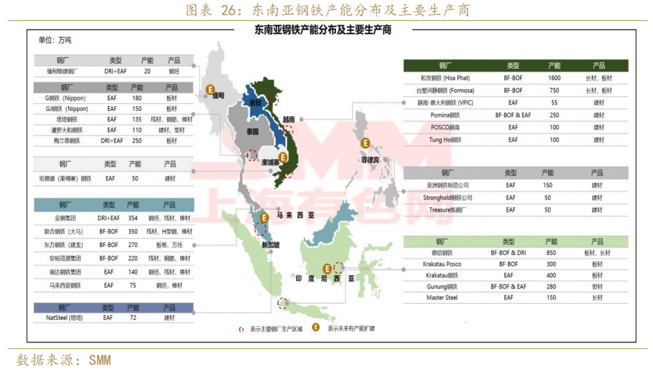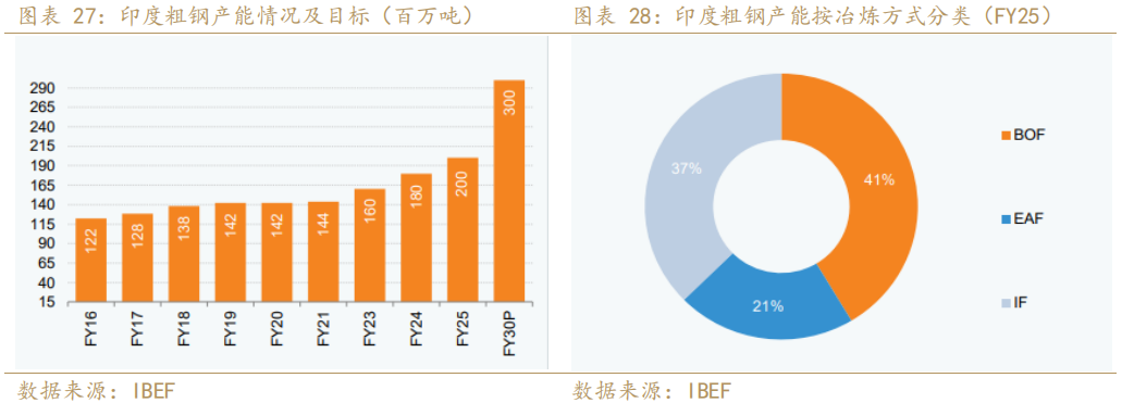 具体到亚洲地区来看,高炉/转炉新增产能主要是在东盟和印度。其中,2026年东盟地区新增高炉产能预期在800万吨左右,主要是在马来西亚和菲律宾。印度的钢铁产能扩张也在稳步推进,根据印度品牌价值基金会(IBEF)的最新报告,2025财年印度钢铁产能已经增长至2亿吨,2026财年印度将新建约4000万吨钢铁产能,建成后印度钢铁产能的高炉/转炉冶炼占比将达到65%。