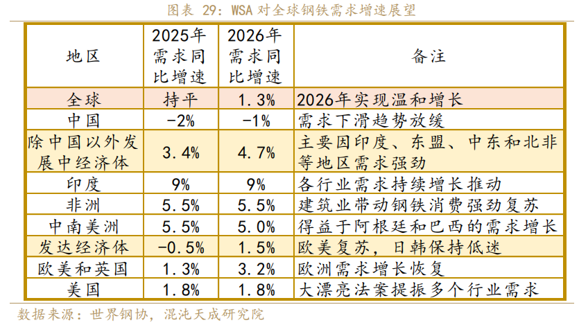 世界钢铁协会最新发布的全球钢铁需求展望报告认为2025年全球钢铁需求将与2024年持平,约为17.49亿吨。预计2026年全球钢铁需求将小幅反弹1.3%,达到17.73亿吨。受益于全球经济恢复,世界大部分经济体建设和投资需求的强劲以及宽松的融资环境,世界钢协预计2026年全球主要发达及发展中经济体的钢铁需求均有增长,中国需求降幅也将放缓,但日韩可能维持低迷。