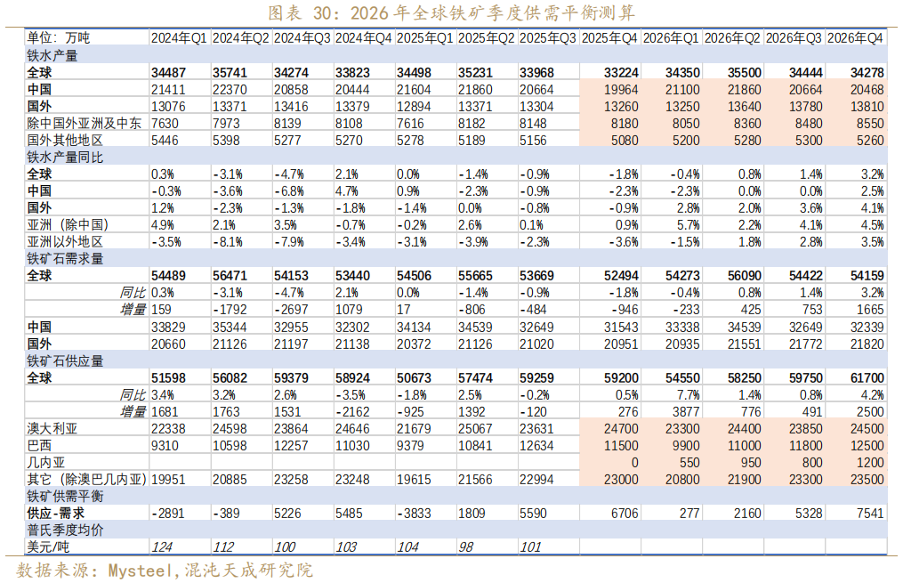综合以上分析,供应端,2026年全球铁矿供应将进入大幅增长期,主流矿、非主流矿及国内矿都有新矿山项目即将面临产能投放,尤其是随着几内亚西芒杜铁矿进入全球供应市场,整体2026年全球铁矿新项目可能带来的贡献量预期将超过1.3亿吨。考虑到一些新项目是对老旧枯竭项目的替代,另外一些高成本低品矿山可能会被高品低成本的新项目替代,预计2026年全球铁矿供应实际增量可能在8000万吨左右。