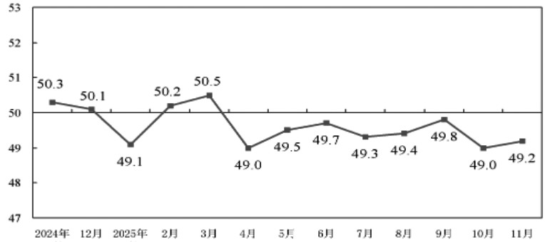 近期公布的宏观数据显示,今年11月官方制造业PMI录得49.2%,较上月回升0.2个百分点。从企业规模看,大型企业PMI由49.9%降至49.3%,连续两个月低于临界值;中、小型企业PMI分别为48.9%和49.1%,较上月分别回升0.2和2个百分点。从分类指数看,生产指数由49.7%上升至50%,重返扩张区间;新订单和新出口订单指数回升至49.2%和47.6%,较上月分别加快0.4和1.7个百分点。整体看,官方制造业PMI尚未摆脱收缩区间,工业生产明显加快,但外需下行压力依然较大,中、小型企业景气度仍待提升。表明我国经济发展呈现不平衡性,生产强、需求弱和服务业强、制造业弱的特征依然较为明显。