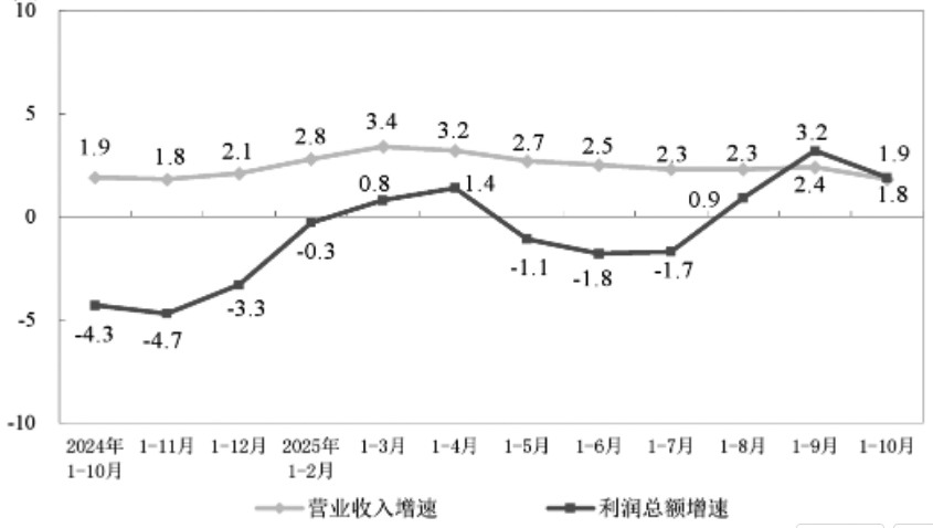 企业盈利方面,今年1—10月全国规模以上工业企业实现利润总额59502.9亿元,同比增长1.9%,增速较上月回落1.3个百分点。其中10月规模以上工业企业利润同比下降5.5%,时隔两个月再次转负。从行业分类看,煤炭、石油、天然气开采等上游原材料加工业利润同比降幅继续收窄,通用设备、专用设备、仪表仪器等装备制造业利润同比增速放缓,纺织服装、家具、化学制品等下游制造业利润同比降幅扩大。1—10月产成品存货同比增长3.7%(前值为2.8%),增速连续两个月回升。相关数据表明,受去年同期基数抬升、需求边际减弱等因素影响,规模以上工业企业利润同比增速放缓,不同行业之间的利润结构出现分化。在“反内卷”和淘汰落后产能政策推动下,新能源、有色金属、煤炭等行业价格回升,有助于上游原材料加工业利润修复。随着大规模设备更新和消费品以旧换新政策效用的下降,家电、移动通讯、消费电子等行业利润增长放缓。由于终端需求不足,下游企业经营压力仍较大,生产成本难以向终端消费者传导,不得不主动减少产量和降低库存。