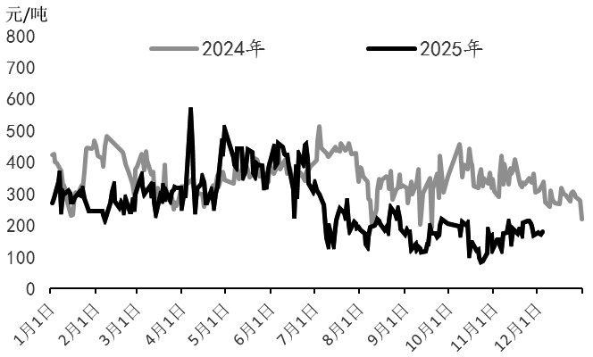 进入12月,终端织造需求进入季节性回落阶段。截至12月5日,江浙加弹综合开工率升至85%,江浙织机综合开工率升至69%,江浙印染综合开工率基本维持在74%,较11月高点已经明显下移。受终端需求季节性回落影响,下游补库节奏明显放缓,聚酯工厂库存连续几周出现累积。虽然短期聚酯负荷韧性仍存,但难以继续提升,预计明年1月以季节性回落为主。届时聚酯对原料刚性需求将减弱,从而会对PTA价格构成一定压力。
