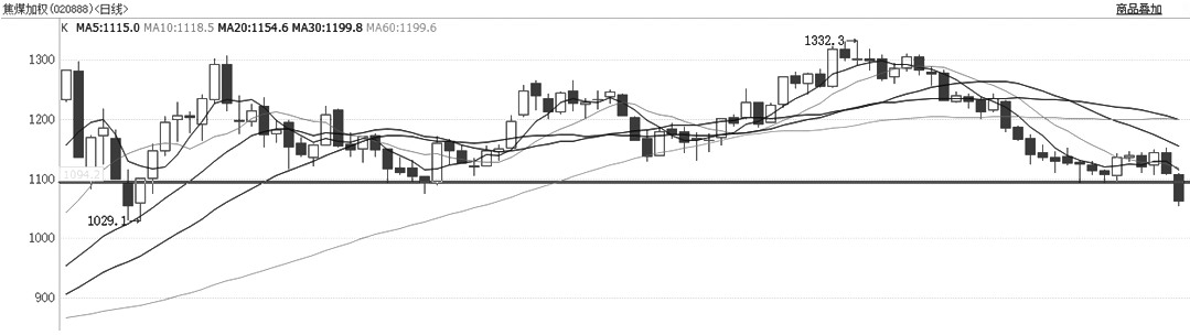 周一,焦煤价格大幅下行,跌破前期震荡平台,打开下方空间。中短周期均线向下运行,K线位于所有均线下方。MACD在零轴下方走弱,绿柱实体有所放大,空头力量短期内有加强迹象。KDJ死叉后发散,指标偏空。量仓方面,成交量明显增长,持仓量整体持稳。这说明多空双方分歧巨大,但经过激烈争夺后,空头主导市场。综合来看,焦煤以空头思路看待。