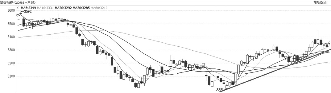 鸡蛋价格构筑双底后维持震荡上行,双底的理论反弹高度在3470元/500千克附近,上周二价格已接近该点位。均线系统整体向上运行,中长期趋势偏多。MACD红柱实体缩小,说明上涨动能逐步衰竭,有可能形成顶背离形态。量仓方面,近期K线实体变小,成交量回落至低位,持仓量持稳,市场观望情绪升温。综合来看,短期多头动能有所减弱,鸡蛋价格或进入高位震荡阶段。(福能期货 张煜)