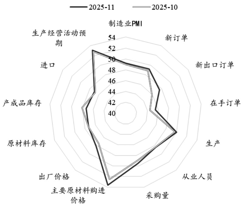 图为10月、11月中国制造业PMI分项对比(单位:%)