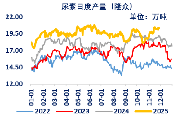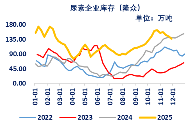 第三,尿素各个环节库存均处于高位,对价格有一定压制。截至2025年12月3日,中国尿素企业总库存量129.05万吨,较上周减少7.34万吨,环比减少5.38%。本周期国内尿素企业库存继续下降,近期储备需求不断补仓以及复合肥工业需求回升,加之部分出口需求推进,尿素企业库存仍处于去库趋势。10月份至今,因物流发运减少,尿素企业虽有订单待发,但库存逐渐增加。10月之后,中原地区连续降雨,秋季肥推迟,加之节前下游多适当补仓,市场交易回温缓慢,尿素企业库存整体较10月份之前大幅累库。目前尿素企业库存总体居历史同期高位,随着国内需求逐渐趋弱,尿素企业检修装置陆续回归,企业库存将继续累库为主,对价格支撑力度进一步减弱。