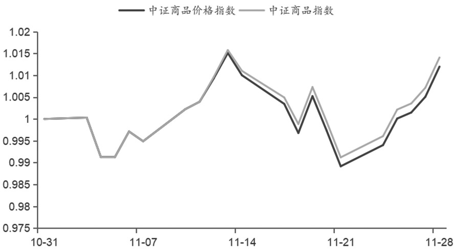 11月,中证商品期货指数(下称中证商品指数)上涨1.41%,中证商品期货价格指数(下称中证商品价格指数)上涨1.20%。整体来看,11月中证商品指数呈窄幅震荡特征,全月振幅仅为2.46%,较10月收窄0.47%。