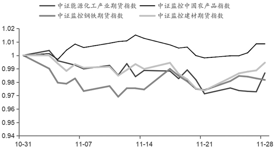 商品市场消费逐渐步入淡季,各板块品种更多围绕自身供需现实与预期展开博弈。11月,除中证监控中国农产品指数外,多数板块指数呈先下跌后上涨趋势,其中,中证能源化工产业期货指数下跌1.32%,中证监控中国农产品指数上涨0.87%,中证监控钢铁期货指数下跌1.84%,中证监控建材期货指数下跌0.55%。