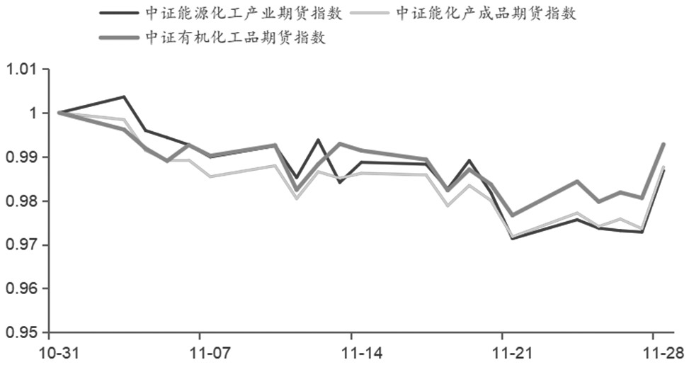 11月,受成本端价格变化影响,能化板块整体呈下跌趋势,只在月末几天出现反弹。其中,中证能源化工产业指数下跌1.32%,中证能化产成品期货指数下跌1.24%,中证有机化工品期货指数下跌0.72%。