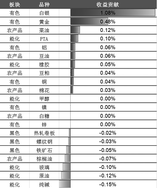 正贡献较大的品种多集中在贵金属板块。该板块受到美联储政策前景分歧与市场避险情绪共振的提振,其中白银还因市场挤仓风险而表现尤为强势。农产品板块的菜油、能化板块的PTA等品种,则依托国内餐饮与服装消费的回暖,录得小幅正贡献。
