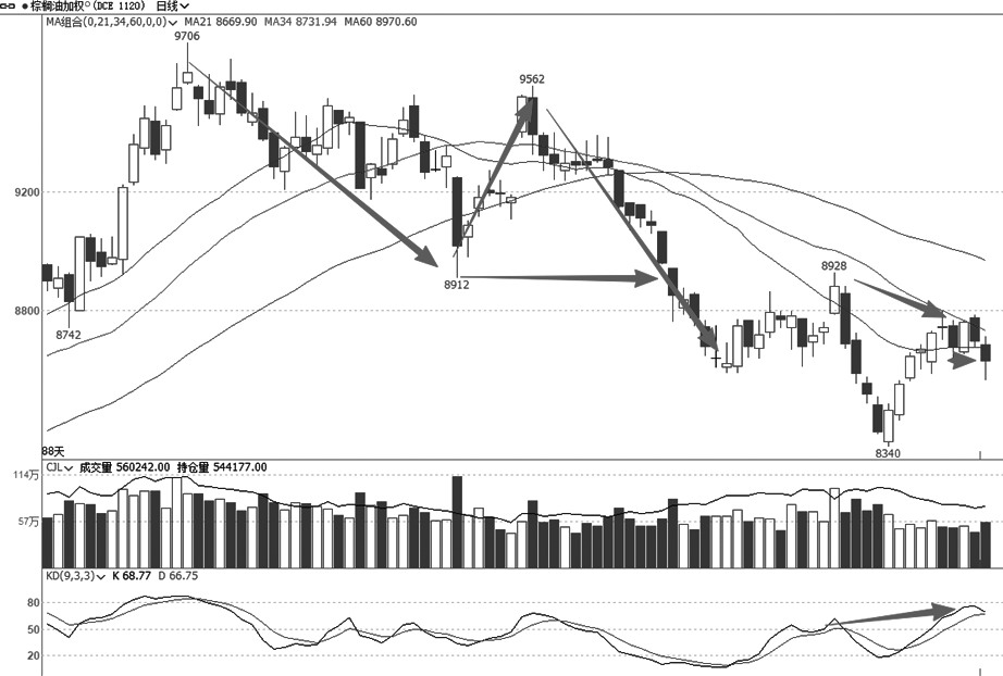 从棕榈油加权日线走势图来看,该品种整体以震荡下行为主,其间虽出现一轮强劲反弹并形成阶段性次高点,但后续涨势未能,随即进入单边下跌阶段,由此确认整体趋势反转。昨日棕榈油以阴锤头K线报收,其收盘价不仅处于均线系统下方,同时价格走势还完成了小双顶形态的有效下破,这一信号预示着本轮反弹已宣告结束,后市大概率延续走低态势,不排除再创阶段新低。(中辉期货 李卫东)