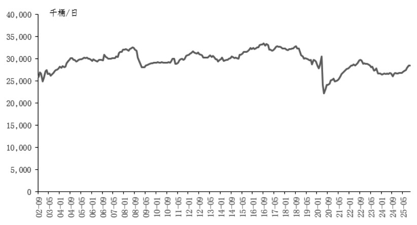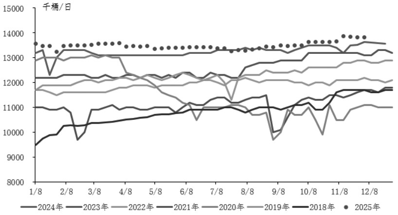 非OPEC+产油国方面,近期美国原油产量屡创新高,截至11月28日当周,产量处于1381.5万桶/日的历史高位附近,同比增加30.2万桶/日。美国能源信息署(EIA)短期能源展望报告将2025年四季度美国原油产量上调4万桶/日,至1386万桶/日。巴西、圭亚那等产油国均有新的原油项目提前投产,EIA短期能源展望报告将2025年四季度非OPEC+产油国的石油供应上调5万桶/日。