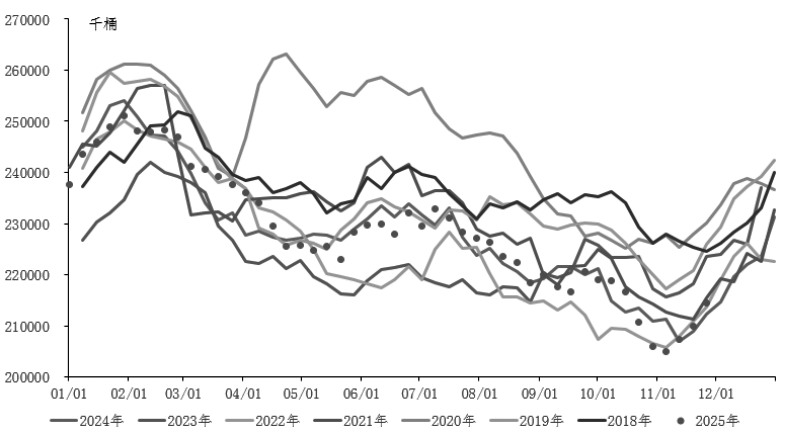 供应方面,11月2日,沙特、俄罗斯等8个OPEC+产油国表示,计划在2025年12月继续增产13.7万桶/日,明年第一季度暂停增产。11月30日,上述产油国重申明年一季度暂停增产,四季度原油市场的供应压力有所增加,明年一季度的供应压力则有所下降。目前,中东地区发电需求下降,原油出口量自9月份以来持续增加。