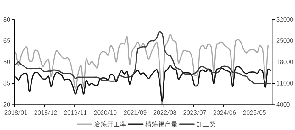 2026年一季度,国内精炼锡冶炼端预计保持平稳运行,原料约束较2025年进一步边际缓解。受益于缅甸锡矿进口增量补充,云南、广西等主产区冶炼厂原料库存压力减轻,开工节奏稳定,预计一季度锡锭供应同比小幅增长。虽然春节假期可能带来部分冶炼厂阶段性检修,但对整体产量影响有限。加工费方面,尽管原料约束有所缓解,但矿端供应改善尚未完全兑现,预计40%品位锡精矿加工费将继续维持在11000元/吨的低位。