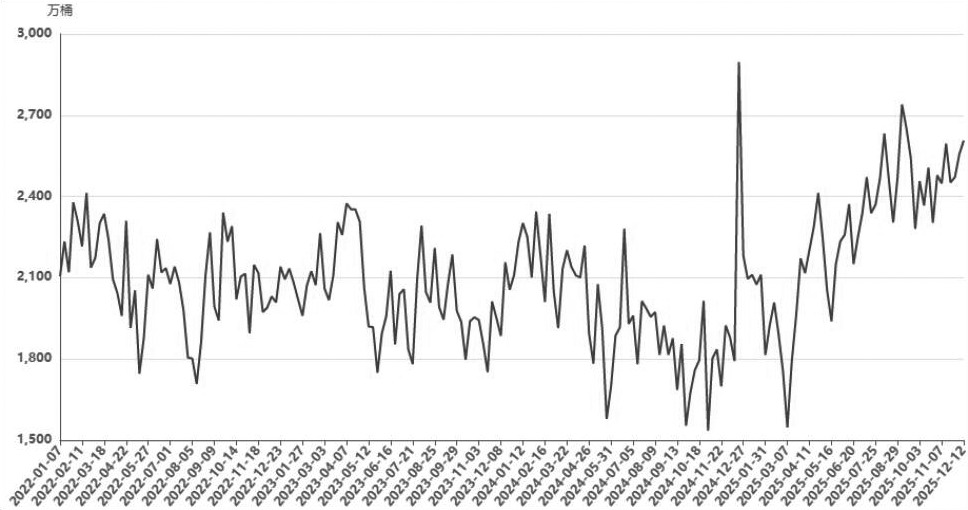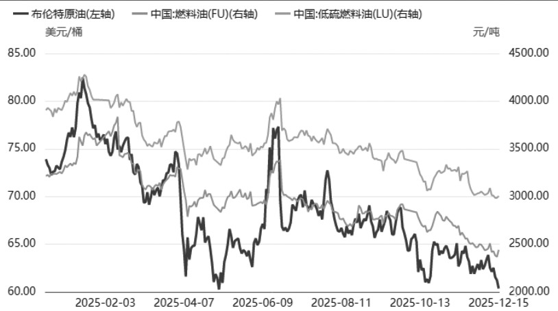 值得注意的是,近期俄乌冲突有缓和迹象。美国和乌克兰的谈判代表12月15日在柏林继续举行会谈。有美方官员表示,谈判整体进展“非常积极”,在多个关键议题上已形成初步共识,并正向达成和平协议迈进。由此可见,2022年以来对原油市场影响最大的地缘政治风险可能显著下降,导致原油价格重心进一步下移。原油期货价格持续走弱,为燃料油市场中长期弱势奠定了基调。