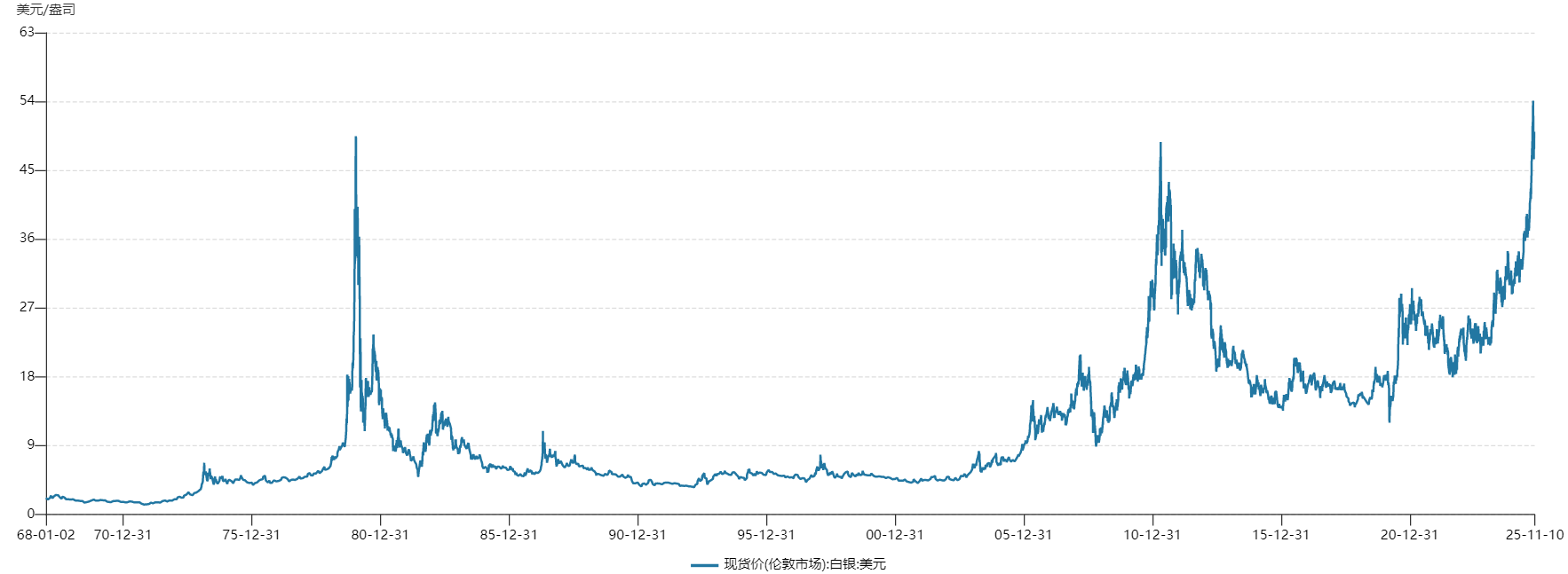 2021—2025年迎来供需共振的历史新高期。金融属性方面,全球“去美元化”浪潮下,白银作为贵金属的储备与避险需求升温;工业属性上,AI算力、新能源(尤其是N型光伏电池)等领域爆发式增长,叠加全球白银库存较2019年峰值下降75%、现货市场持续短缺,形成刚性需求支撑。2025年行情尤为强劲:1-5月窄幅拉锯后,6月因库存告急与光伏需求爆发加速突破,10月伦敦现银创下54.47美元/盎司历史新高,COMEX白银期货同步走强,年末价格较年初涨幅超90%,且国内沪银期货同步创下13278元/千克高位,内外盘形成联动上涨格局。