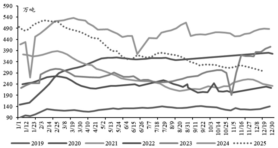短期来看,PTA处于供需紧平衡、库存低位的格局,成本支撑、供应收缩与需求增量形成共振,期价偏强态势有望延续,但终端需求转弱与供应回升预期将制约其上行空间。12月下旬,随着检修装置重启,供应或小幅回升,虽然印度出口增量持续释放,但终端需求季节性下滑幅度可能更大,叠加聚酯进入季节性降负周期,预计2026年1—2月PTA库存将转为小幅累积。