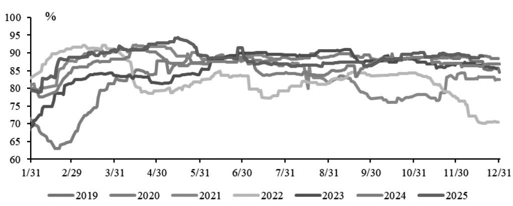 库存结构上,PTA库存可用天数处于近5年低位,聚酯工厂原料库存维持在刚需水平,但聚酯成品库存有所上升,企业利润承压,预计2026年1月将进入季节性降负阶段。