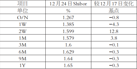 近期,国内资金市场利率表现分化。截至12月24日,上海银行间同业拆放利率(Shibor)隔夜、1周期、3月期、6月期、9月期、1年期分别报收于1.267%、1.385%、1.6%、1.629%、1.64%、1.65%,较12月17日分别下降0.8、4.3、0.1、0.3、0.3、0.3个基点;2周期、1月期分别报收于1.599%、1.579%,较12月17日分别上升12.8、3.8个基点。