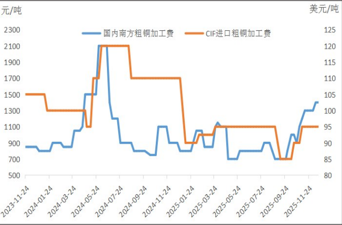 2025年1—10月,我国粗铜产量累计为1010万吨,同比增加13.02%。其中,矿产粗铜产量837.09万吨,同比增加12.76%。废铜产粗铜量172.91万吨,同比增加14.31%。进口方面,2025年1—10月,我国累计进口粗铜63.4万吨,同比减少15.01%,进口比价倒挂、非洲地区运力不足及电力供应不稳定等限制了进口阳极铜的流入。另外,铜精矿紧缺下,海外对阳极铜的需求亦增加。