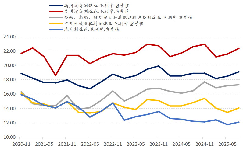 数据显示,当前专用和通用设备制造业的毛利率稳定在20%的高位水平;铁路、船舶、航空航天设备制造业毛利率达到17%的较高水平;电器机械及器材制造行业的毛利率接近15%;汽车制造业毛利率超过10%。由此可见,随着我国制造业技术优势不断提升以及成本优势不断扩大,其在国内和全球经济中所占的份额有望继续提升。