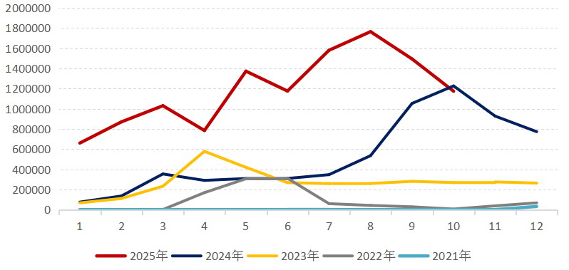 根据海关总署数据,2025年1—10月,我国累计出口钢材9775万吨,同比增长570万吨,增幅为6.2%;累计出口钢坯1190万吨,同比增长727万吨,增幅为157%;钢材和钢坯出口增量合计达到1297万吨。