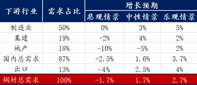 综上所述,我们对2026年钢材需求做出三种情景假设:中性情景下,钢材出口预计增长2.5%(300万吨),需求增长1.7%;乐观情景下,钢材出口预计增长4%(500万吨),需求增长2.7%;悲观情景下,钢材出口预计下降4%(500万吨),需求下降1.7%。