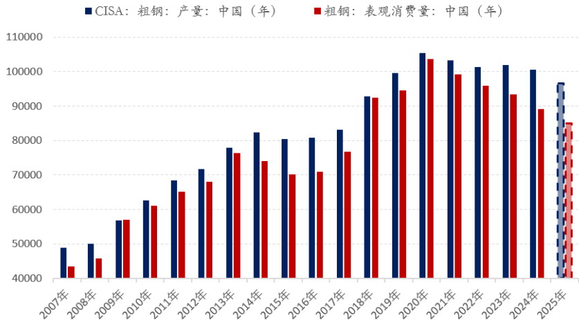 自2020年以来,国内钢材市场呈现供需双降态势。2025年,预计国内钢材需求将降至8.5亿吨的低位水平,过去5年国内需求累计下降18%,年均降幅为3.6%;预计粗钢产量将降至9.65亿吨,过去5年粗钢产量累计下降9.4%,年均降幅为1.9%。经过5年的持续大幅下滑,2026年预计国内需求将逐步趋稳,改善回升预期将逐渐增强。