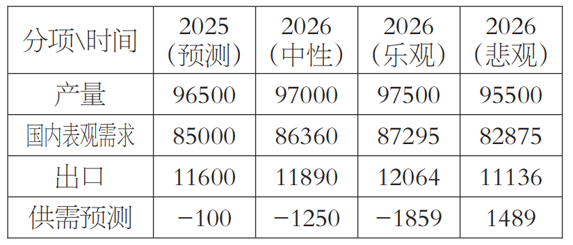 2026年,我们对粗钢供需作出三种情景假设:中性情景下,国内表观需求增长1.6%,产量增长500万吨,出口增长2.5%,全年粗钢供应短缺1250万吨;乐观情景下,国内表观需求增长2.7%,产量增长1000万吨,出口增长4%,全年供应短缺1859万吨;悲观情景下,国内表观需求下降2.5%,产量下降1000万吨,出口下降4%,全年供应过剩1489万吨。
