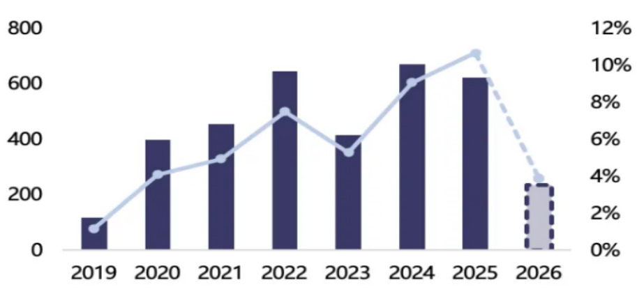 展望2026年,由于海外大型新增产能项目较少,且部分产能可能延期至2027年,预计海外新增产能释放压力将有所缓解。当前阔叶浆厂库存压力尚可,预计其发运量增速将放缓。而针叶浆虽无新增投产,但由于整体库存处于历史偏高水平,且近几个月发运量持续回升,短期内预计仍保持小幅增长趋势。后续若欧洲浆纸消费随经济回暖,发往中国的贸易浆比例可能有所回落,预计2026年上半年进口增量相对有限。